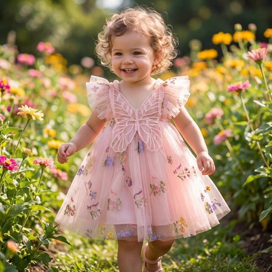 The butterfly detail on the back adds a charming touch, while the embroidered floral pattern gives the dress a soft and elegant look. The layered skirt provides room for movement, allowing little ones to walk, play, and explore comfortably. This dress is a thoughtful choice for special occasions where comfort and style are equally important.